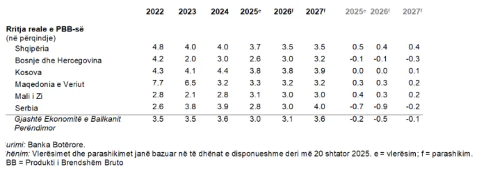 Raporti i Rregullt Ekonomik për Ballkanin Perëndimor parashikon që rritja ekonomike e kombinuar e Shqipërisë, Bosnjës dhe Hercegovinës, Kosovës, Malit të Zi, Maqedonisë së Veriut dhe Serbisë do të arrijë në 3.0 për qind në vitin 2025, që është 0.2 pikë përqindje më e ulët se parashikimet e mëparshme. Rritja parashikohet të përshpejtohet në 3.1për qind në vitin 2026 dhe 3.6 për qind në vitin 2027.