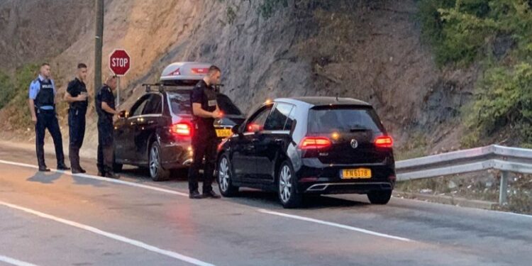 Dy vetura, njëra me një flamur serb në dritaren e pasagjerit, dhe disa persona pranë tyre shihen të vendosur në mes të rrugës që çon në pikën kufitare drejt Kosovës, në Merdarë.