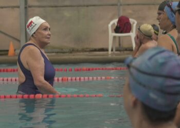 Eliana Busch me rrahjet e rregullta të krahëve e trupit, kalon shpejt gjatësinë e pishinës ku…