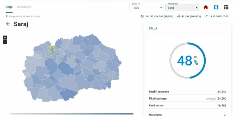 Sipas të dhënave të fundit nga Komisioni Shtetëror i Zgjedhjeve, në Komunën e Sarajit deri në orën 17:00 kanë votuar 16.462 qytetarë, që përbën 48.01% të numrit të përgjithshëm të votuesve të regjistruar – 34.341.
