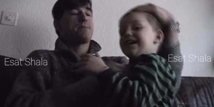Në video, Veseli, atëbotë në moshë të re, shihet teksa mban në duar një fëmijë.