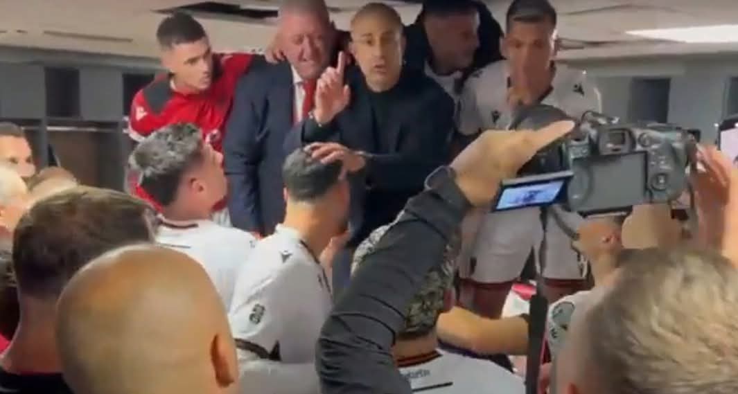 Pas fitores, një festë e çmendur “shpërtheu” edhe në dhomat e zhveshjes, aty ku u bashkua dhe presidenti i Federatës Shqiptare të Futbollit, Armand Duka.