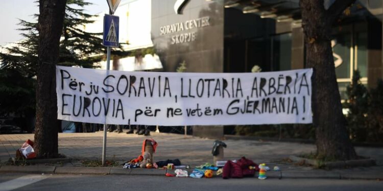 Prandaj, ne sot në mënyrë simbolike i kemi sjellë këtu mbetjet e familjeve që na kanë braktisur ndërkohë. Secila familje që ka ikur për shkak të këtyre politikanëve të korruptuar ka lënë pas vetes çanta, libra, fletore e lodra fëmijësh, duke kërkuar një jetë më të mirë për fëmijët e tyre. Këto ne sot po ia lëmë këtu pronarit të Soravia-s, që t’i ketë si kujtim nga të gjitha ato familje që ai dhe bashkëpunëtorët e tij i kanë përzënë nga vatrat e tyre. Le ta dijë gjithë opinioni se mbi 300 mijë njerëz janë shpërngulur nga Maqedonia e Veriut vetëm nga viti 2002. Kaq na ka kushtuar pasurimi i familjes Ahmeti e Grubi.