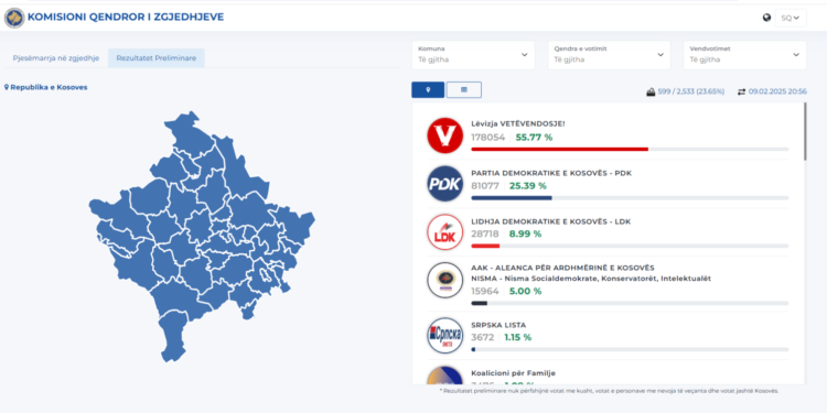 Numërohen 23.65% e votave, Lëvizja Vetëvendosje e para me 55.77%, PDK e dyta, AAK në prag
