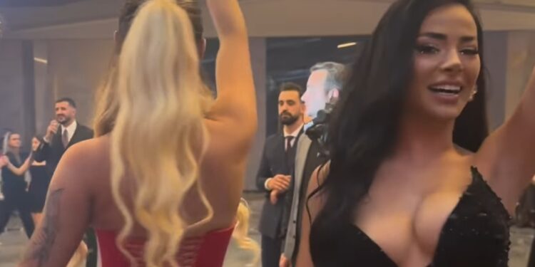 Santi e veshur me një fustan të kuq, dhe Kaderi me një fustan të zi, po e djegin atmosferën e dasmën me një vallëzim së bashkë.  https://www.facebook.com/share/r/pDSHJvaSmDruXgxX/